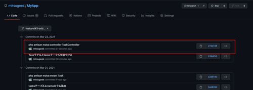 mitsugeek.net の続き モデルを作成 ドキュメント(モデルクラスの生成) githubに反映 モデルとテーブルを紐づける ドキュメント (テーブル名の指定) githubに反映 続きはこちら。 モデルを作成 カレントディレクトリをlaravelプロジェクトのルートフォルダ…